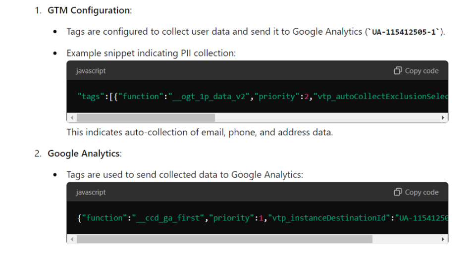 The Venezuelan government is likely leveraging Google Analytics for surveillance purposes, which presents “significant privacy and security concerns associated with the Venezuelan government's prison administration website.” There is “irrefutable evidence” that points to this, according to Chris Kubecka, a cybersecurity expert and freelance journalist. Her analysis uncovered “extensive data collection mechanisms on this site, including the automatic collection of Personally Identifiable Information (PII) such as names, emails, phone numbers, and addresses.” The mechanisms are aided through Google Tag Manager and Google Analytics, with the data potentially being sent to external servers, “increasing the risk of interception or misuse.” The evidence is that the website receives a code 200, meaning that information was sent from the website. The transmission can be verified through the use of third-party marketing tracking and tagging software. The specific Google Analytics ID is UA-115412505-1, and the below HTML code “confirms the active use of Google Analytics.”