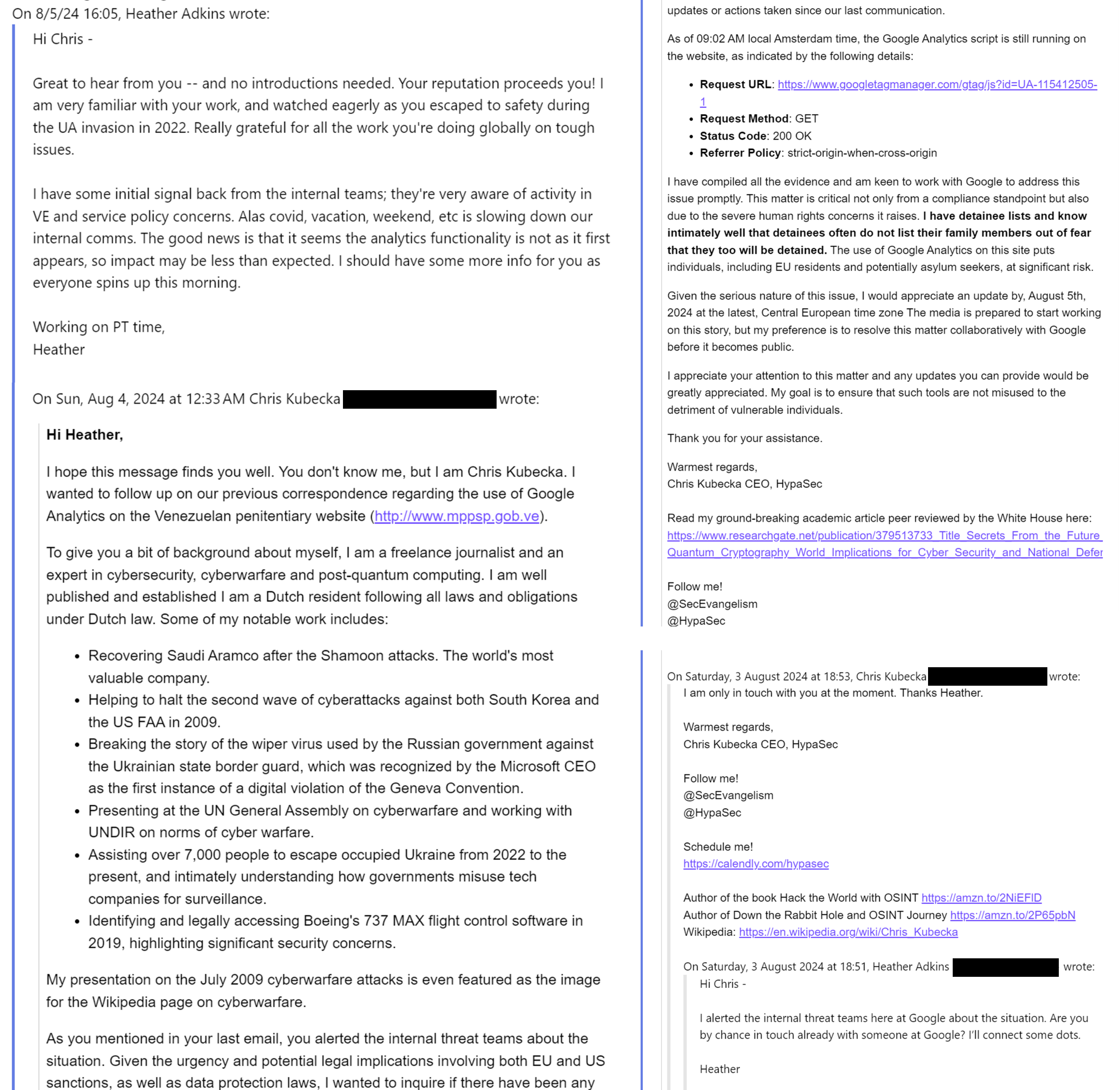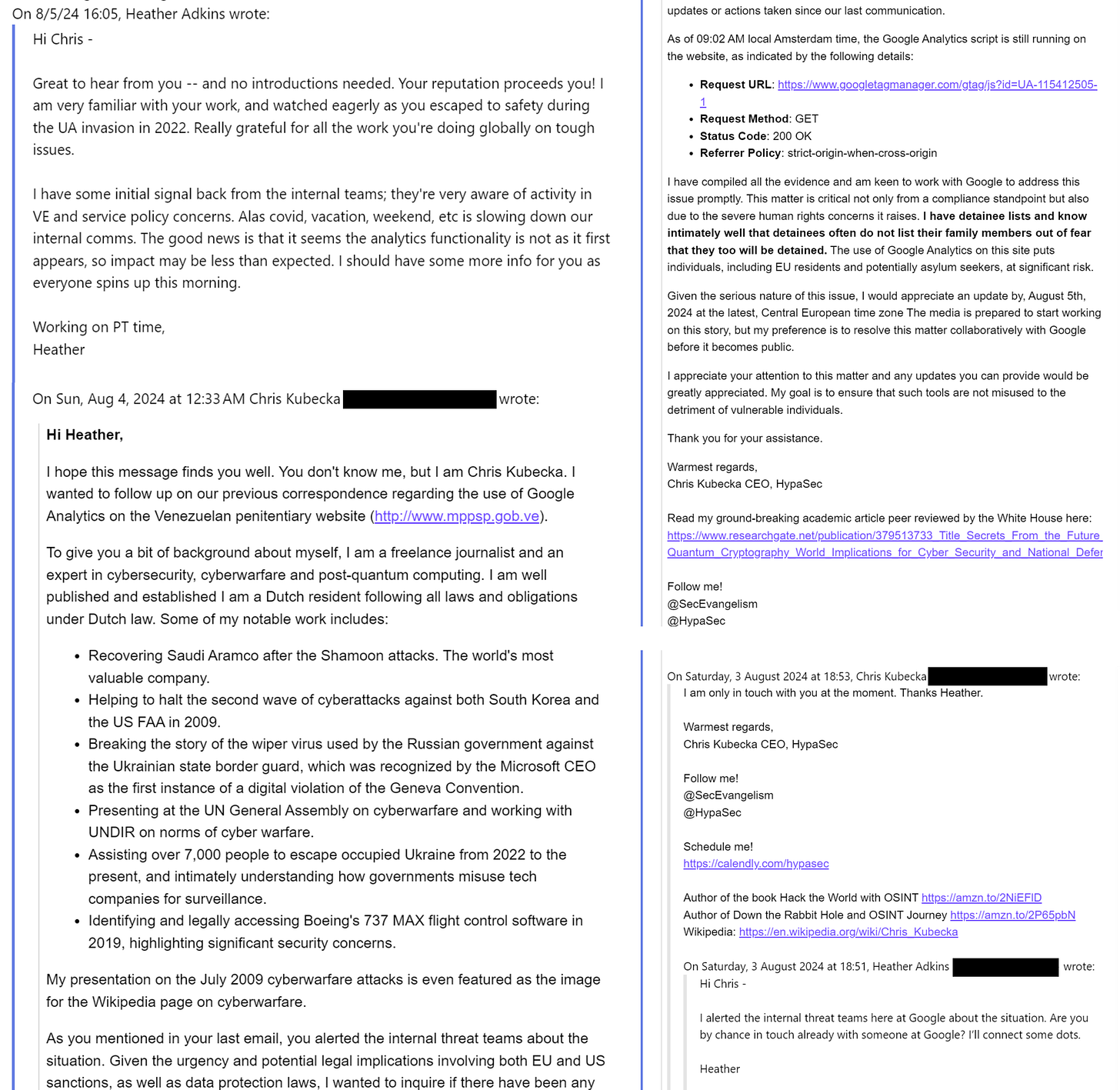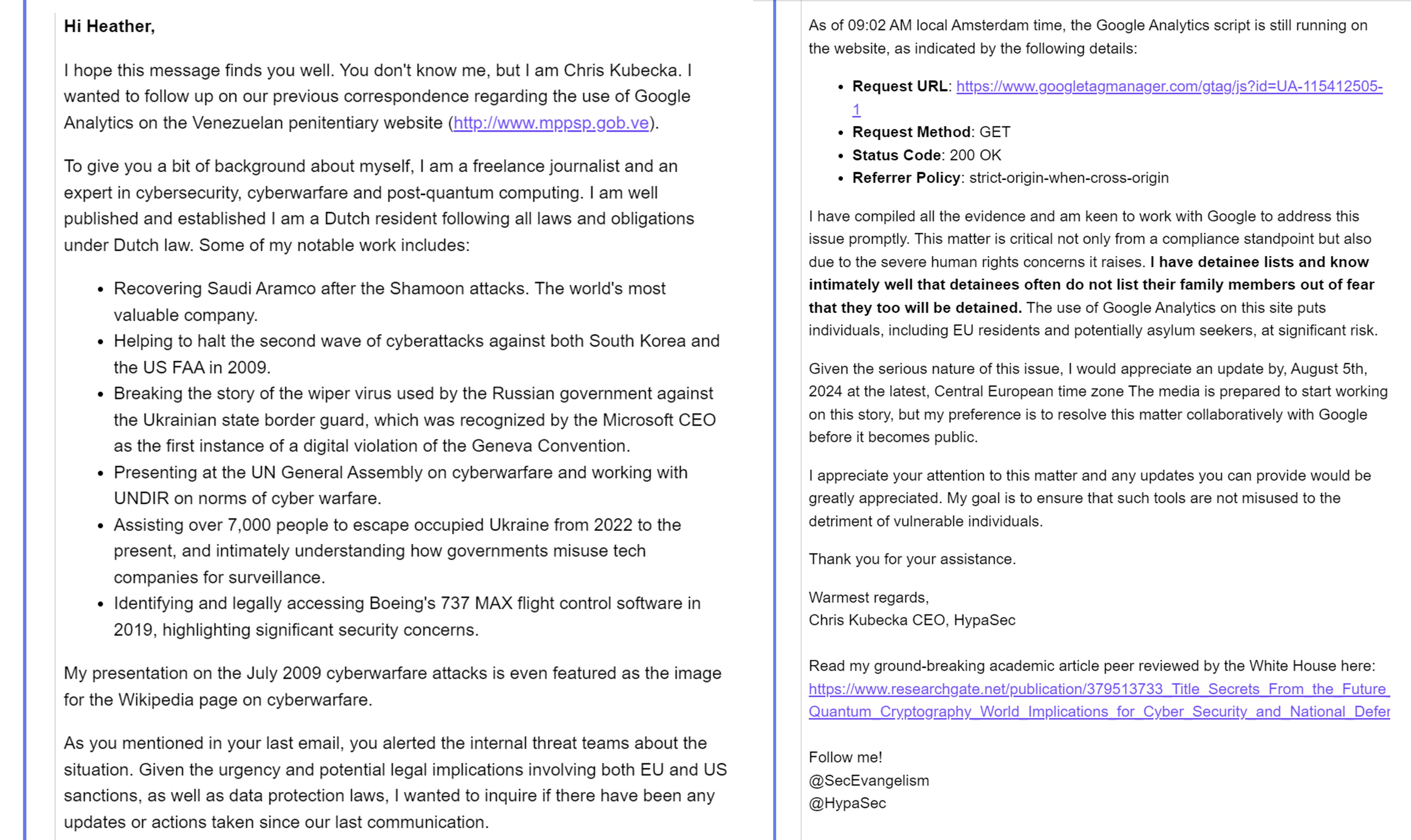 Kubecka previously communicated with Google’s internal threat teams to notify them about the Venezuelan government’s use of Google Analytics and Google Tag Manager. She spoke with Google’s Vice President of Security Engineering, Heather Adkins, via email last week to notify her of the issue so it could be handled through backchannels. Adkins did reply to the researcher to say she received the email, notified the internal threats team, and asked if she could connect them with other Google employees who would help in the situation on August 3rd. Kubecka sent Adkins an email on August 4th for an update regarding the issue due to “the urgency and potential legal implications involving both EU and US sanctions, as well as data protection laws.”