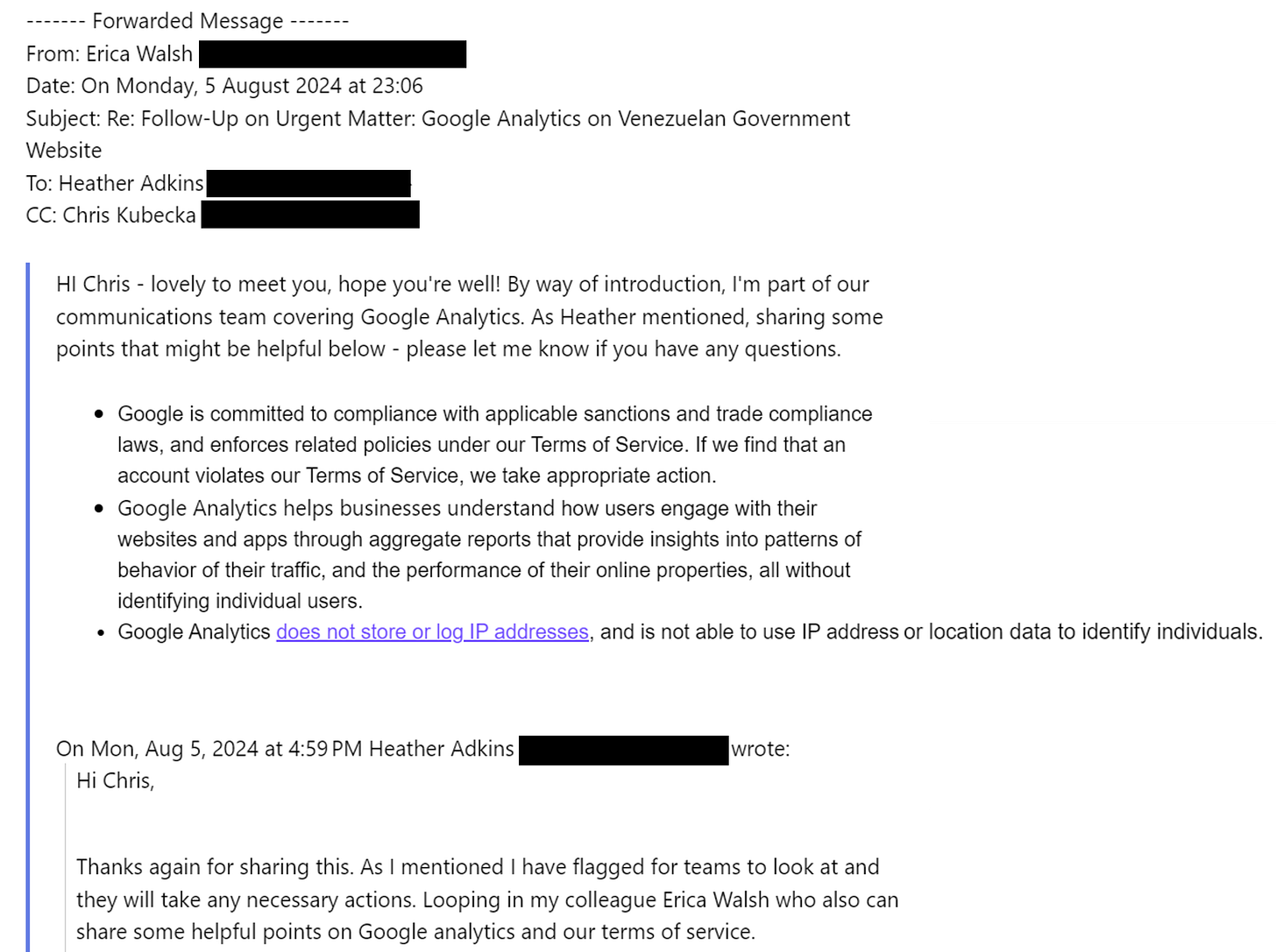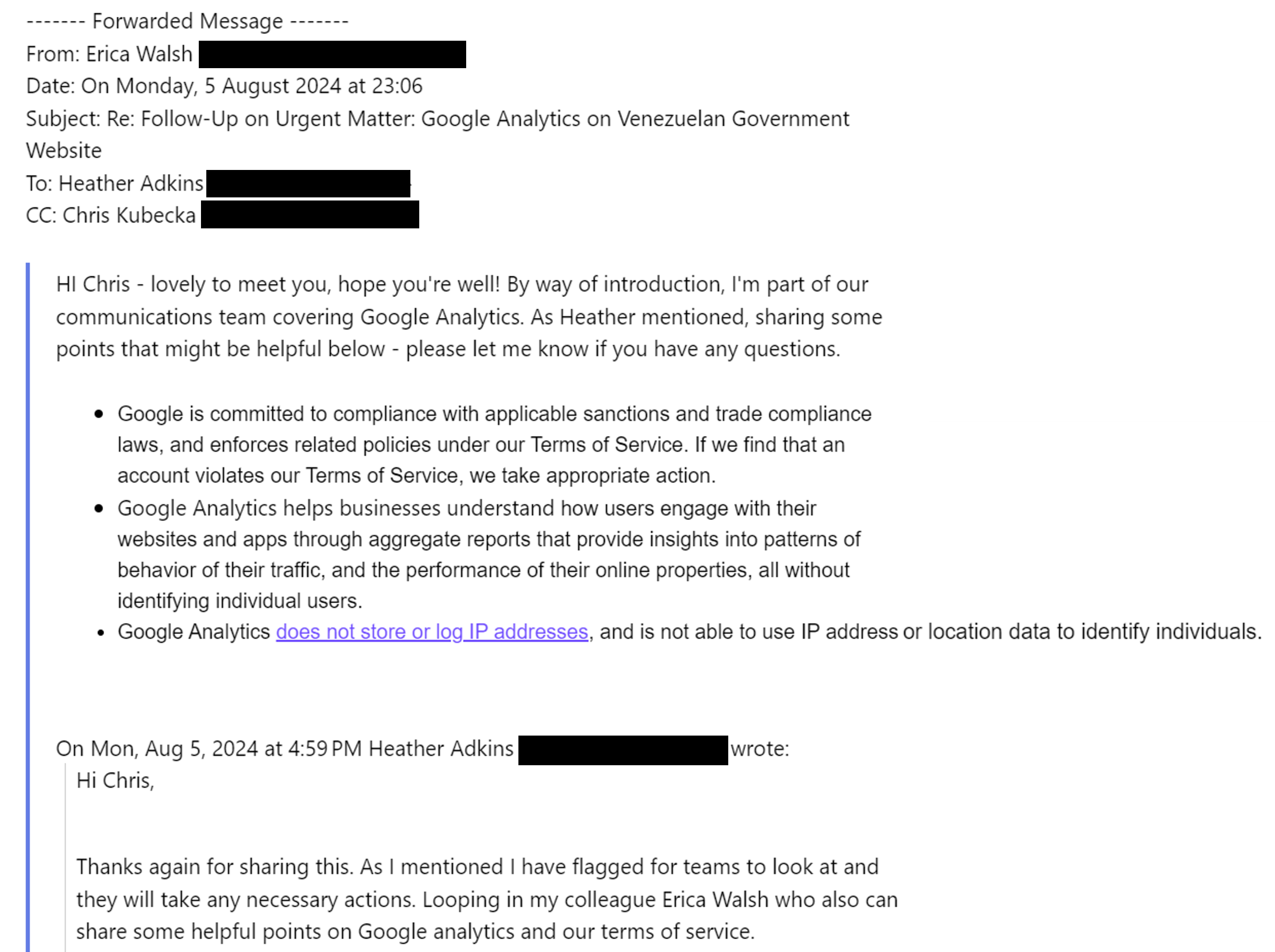 Heather replied to the individual’s email and included Erica Walsh, the Communications Manager for Google Ads, so she could share “some helpful points” on Google Analytics and the company’s terms of service. Erica then followed up with an email to the researcher, who provided the individual with three points. The first point is that Google “is committed to compliance with applicable sanctions and trade compliance laws and enforces related policies under our Terms and Service.” She said that if Google discovers an account that violates our Terms of Service, then they will take appropriate action. Erica then explained how Google Analytics “helps businesses understand how users engage with their websites and apps through aggregate reports that provide insights into patterns of behavior of their traffic and the performance of their online properties all without identifying individual users.” The last point Erica mentioned is that Google Analytics “does not store or log IP addresses and is not able to use IP addresses or location data to identify individuals.”