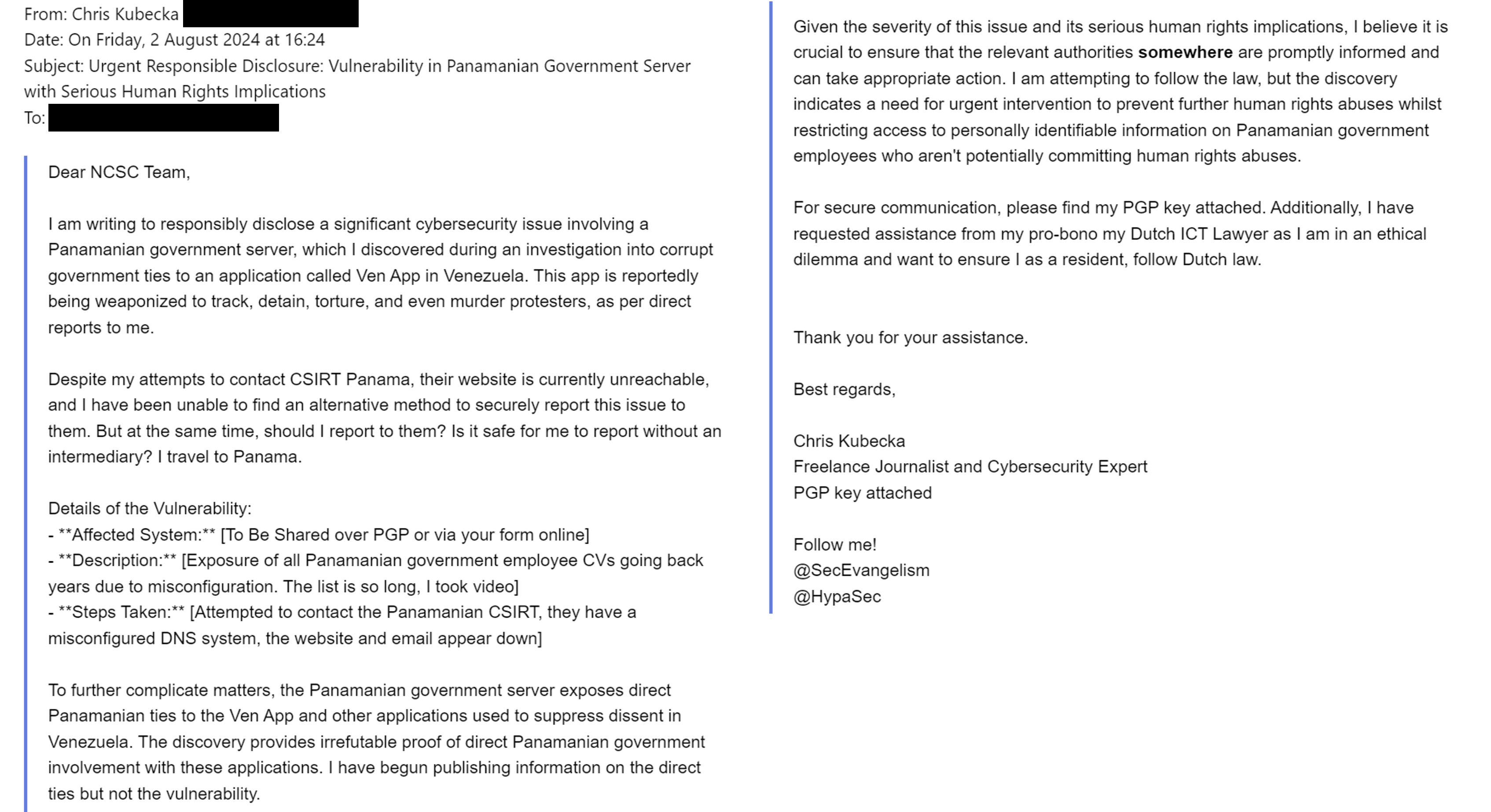 The individual discovered a misconfiguration that left the server unsecured and allowed them to view the CV. The vulnerability allowed the researcher to view all the CVs of all employees who worked for the Panamanian government going back several years. The researcher emailed the NCSC to inform them of the vulnerability and the potential leak of employees' PII. In the email, they pointed out that they attempted to disclose the issue to the Computer Incident Response Team for Panama, but their website was down due to a misconfigured DNS system.